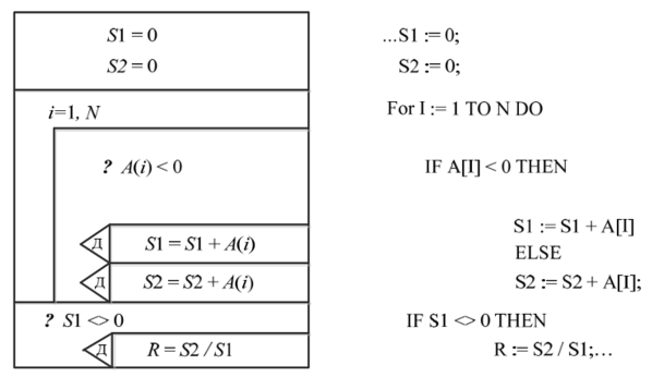 элементов этого массива. Справа от диаграммы (рис. ниже) приводятся соответствующие операторы языка Turbo Pascal.