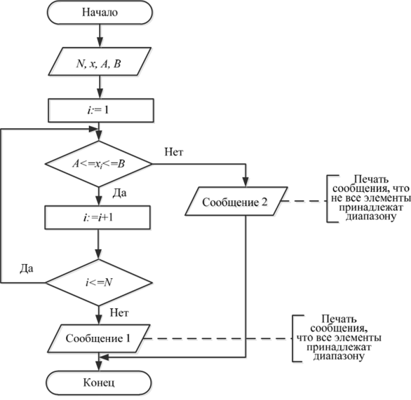Шаг 6. Печать сообщения: «не все элементы принадлежат интервалу» — на шаг 7.